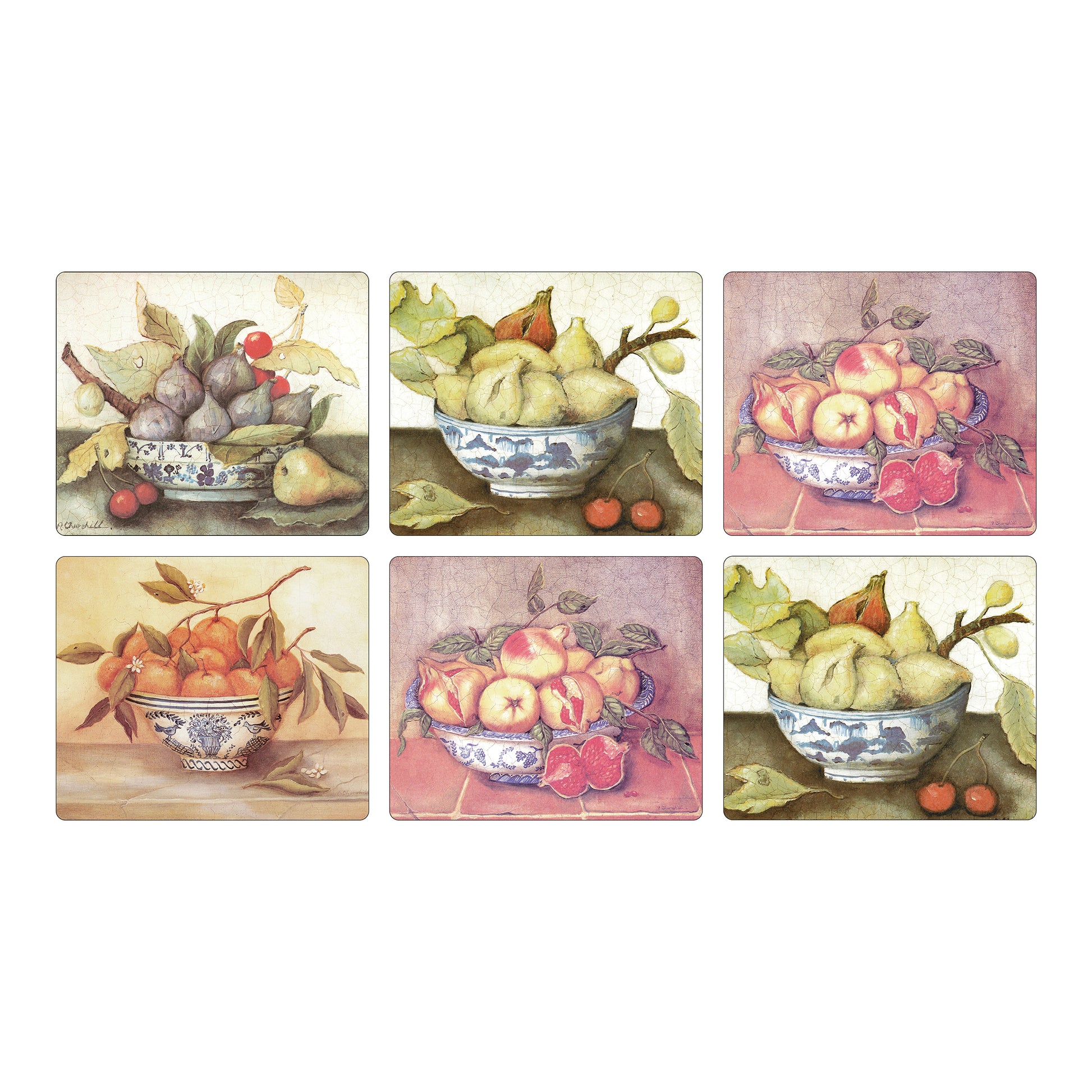 Boxed set of 6 Melamine Tablemats Mediterranean Fruit with green felt backing. Note: This set features a combination of four different designs with two designs duplicated.