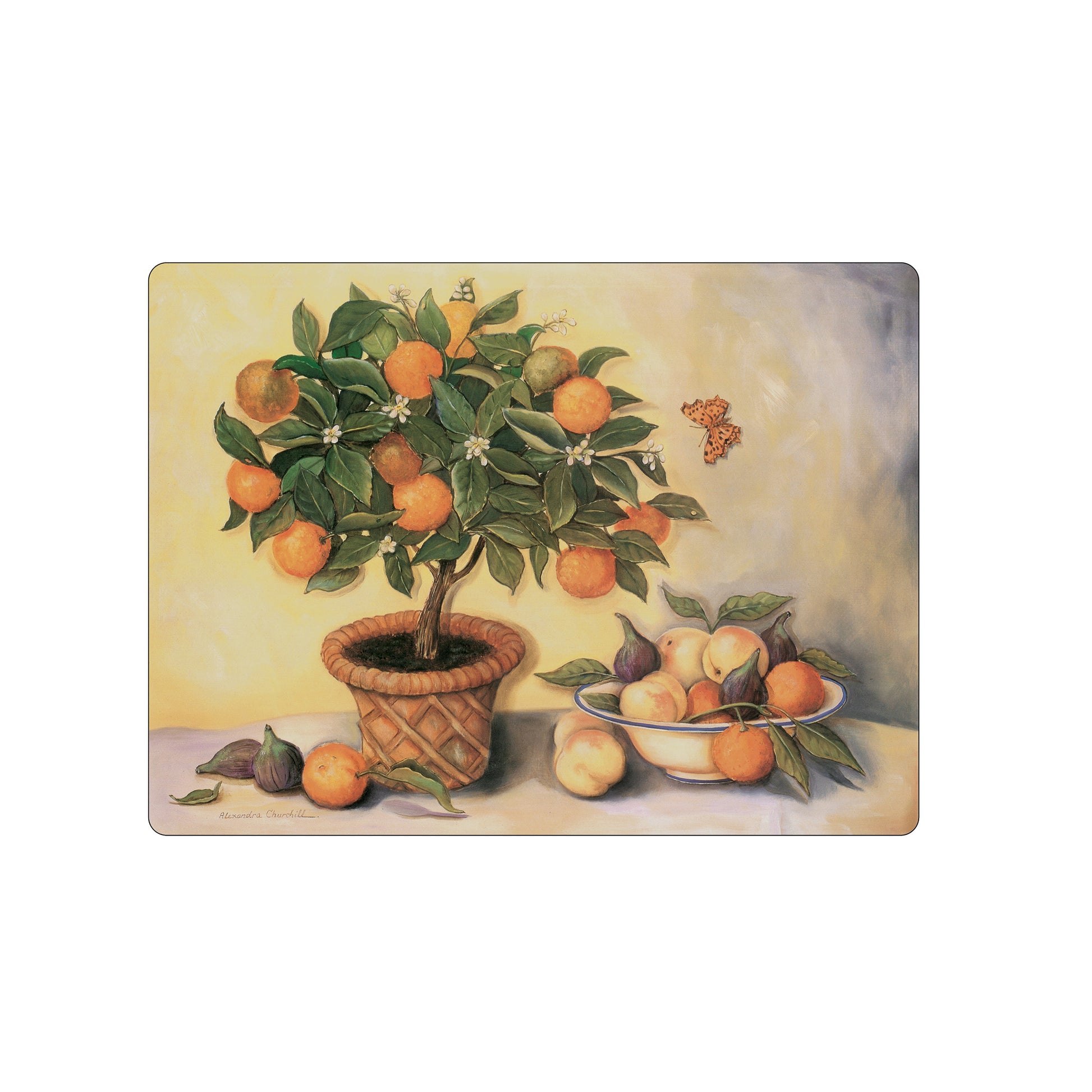 Boxed set of 4 Melamine Placemats Orange Tree with green felt backing. Note: This set comprises a single design.